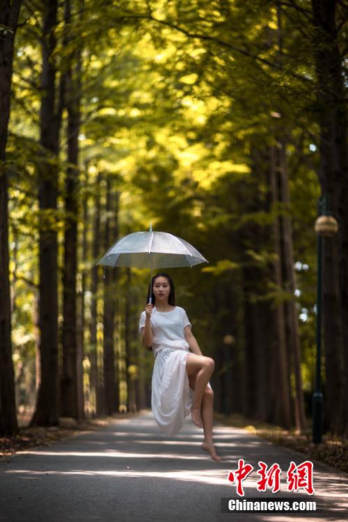 Xiao Ge takes amazing shots of herself floating in the air. Xiao Ge is a dancer from POLE 11, China's first pole dance girl group.(Photo/Chinanews.com)
