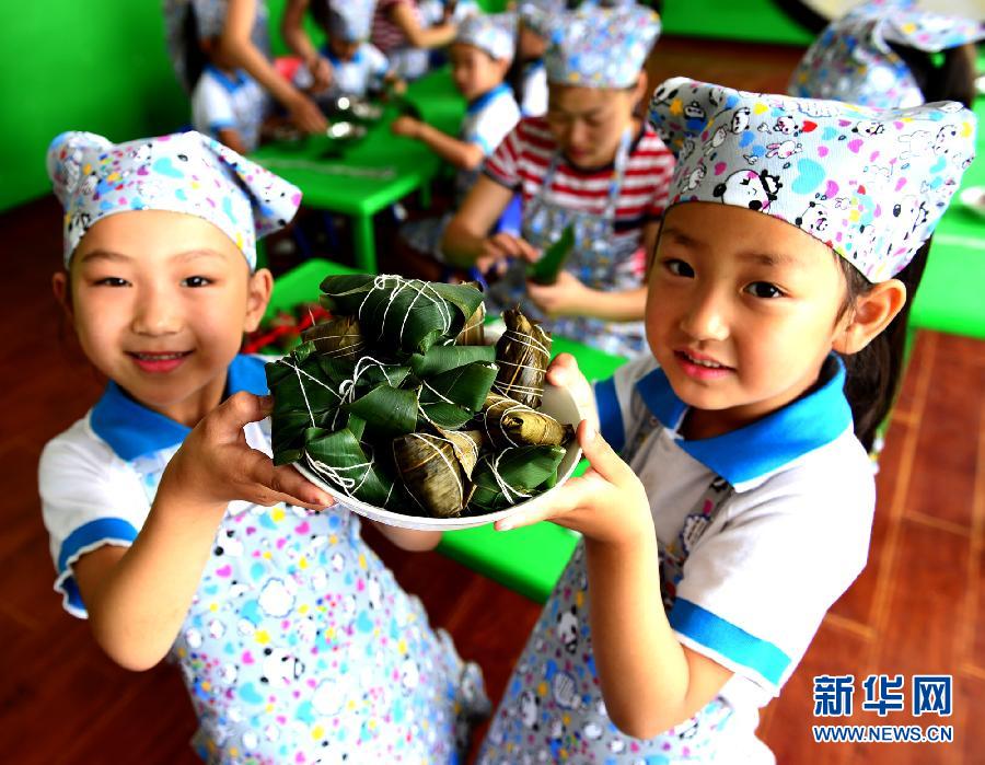 Children in Jinding Kindergarten presented self-made zongzi in Handan, north China's Hebei province on Tuesday.(Photo/Xinhua)