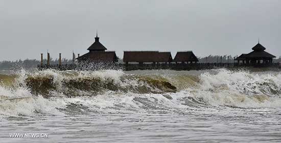 Big waves surge at the Gaolong Bay in Wenchang, a coastal city in south China's Hainan Province, June 22, 2015. Tropical storm Kujira strengthened into a typhoon in the South China Sea on Sunday, which is moving northward and likely to become the first typhoon to hit China this year. (Xinhua/Guo Cheng) |