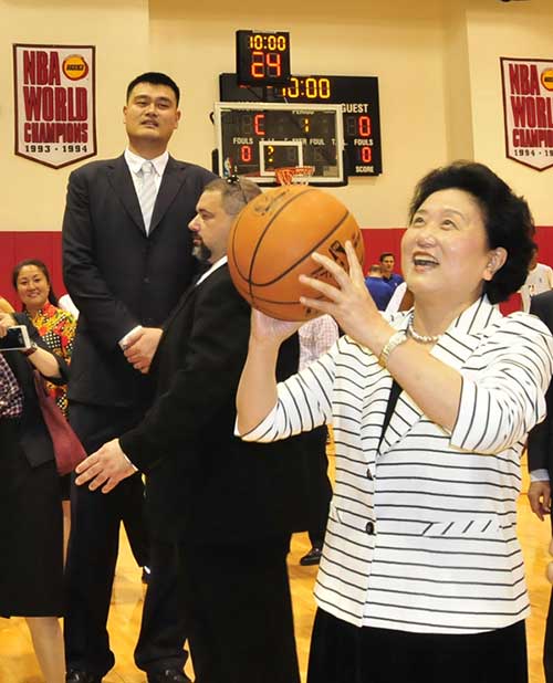 Vice-Premier Liu Yandong shoots for the hoop at NBA basketball team Houston Rockets' home court Toyota Center watched by former Rockets star Yao Ming. A group of Chinese student athletes from Tsinghua High School are working on a basketball training program with the Rockets. Liu will attend the 7th China-US Strategic and Economic Dialogue in Washington on Tuesday. [Photo by Zhang Yongxing / Xinhua] |