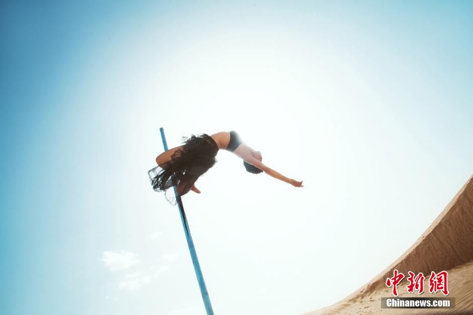 Fang Yi takes promotion photos for pole dancing in desert. (Chinanews.com/Yuan Biao)