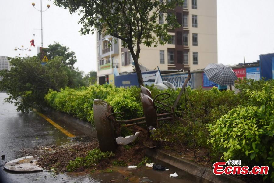 Strong winds brought by typhoon Kujira topple a street lamp in downtown Qionghai, South China’s Hainan province, June 23, 2015. (Photo: China News Service/Meng Zhongde)