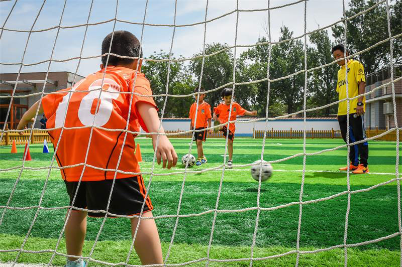 Beijing Liuyi Kindergarten established its first football team made up of young children and built an artificial pitch covering nearly 200 square meters. For each football class, these children undergo serious training on the pitch.(Photo/Xinhua)
