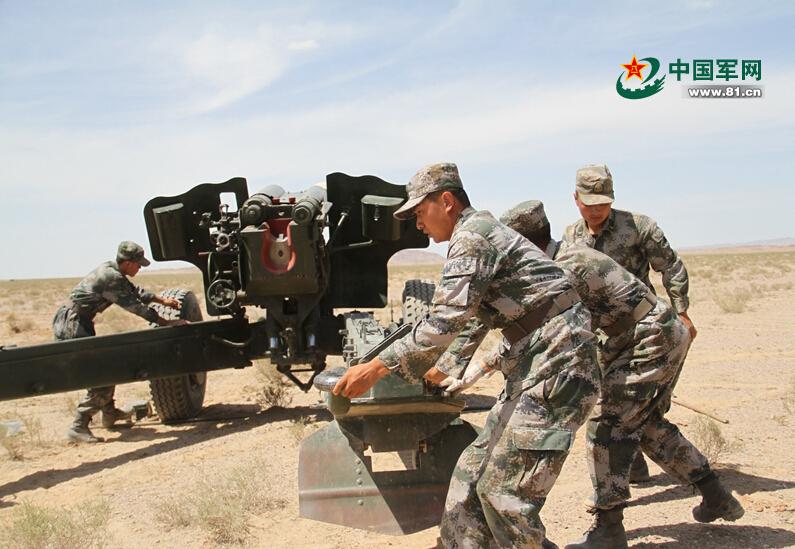 PLA soldiers of an artillery regiment from Lanzhou Military Region recently conduct a live shell drill in Gobi desert. The drill helps to build up the courage and fighting capability of the soldiers in harsh environment. (Photo/81.cn)