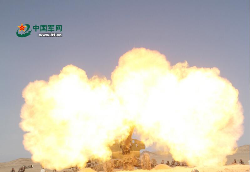 PLA soldiers of an artillery regiment from Lanzhou Military Region recently conduct a live shell drill in Gobi desert. The drill helps to build up the courage and fighting capability of the soldiers in harsh environment. (Photo/81.cn)