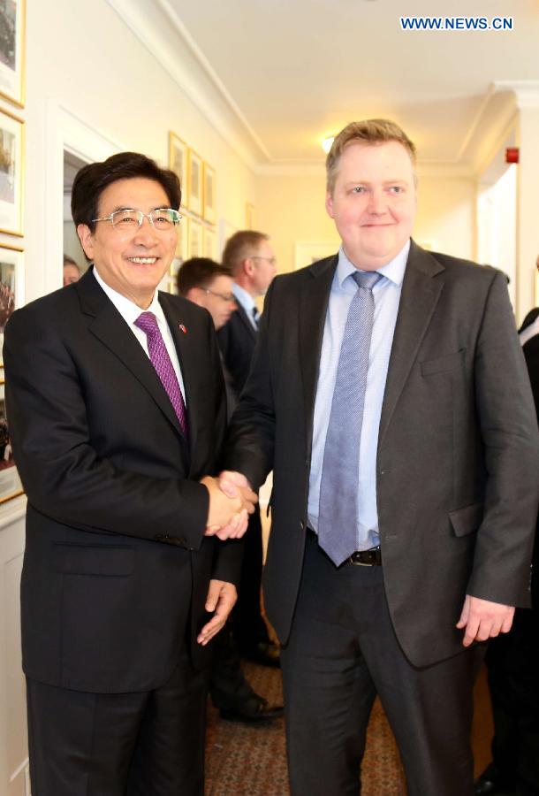 Iceland's Prime Minister Sigmundur David Gunnlaugsson (R) meets with Guo Jinlong, a member of the Political Bureau of the Communist Party of China (CPC) Central Committee and secretary of the CPC Beijing Municipal Committee, in Reykjavik, capital of Iceland, on June 23, 2015. (Xinhua/Huang Xiaonan) |
