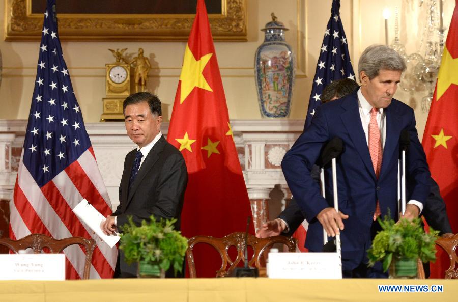Chinese Vice Premier Wang Yang (L) and U.S. Secretary of State John Kerry attend a joint press conference after the seventh China-U.S. Strategic and Economic Dialogue (S&ED) in Washington D.C., the United States, June 24, 2015. Top Chinese and U.S. officials wrapped up Wednesday their two-day high-level talks here with substantial outcomes in strategic and economic sectors, as well as people-to-people exchanges. (Xinhua/Yin Bogu) |