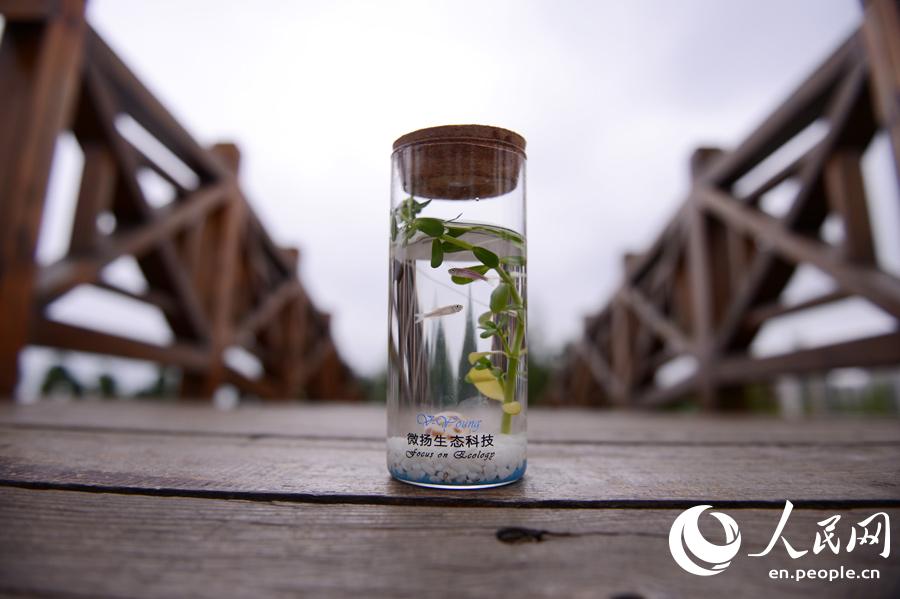 Several students majoring in bioscience and engineering in Fuzhou University in southeast China’s Fujian province invented a micro-ecological fish bottle which has a stable ecosystem. The bottle contains basic elements of a food cycle, including fishes, green plants, snails and microorganism, so the fish barely needs feeding or changing water. With the support of Fuzhou University, the fish bottle has been put into market — students of the R&D team have established a company to sell their products. (Xinhua/Jiang Kehong) |