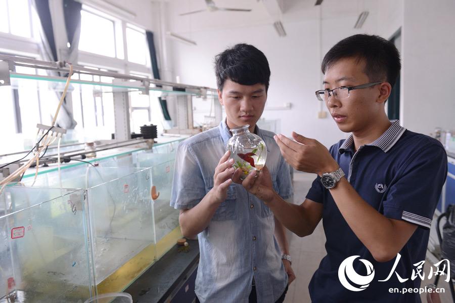Several students majoring in bioscience and engineering in Fuzhou University in southeast China’s Fujian province invented a micro-ecological fish bottle which has a stable ecosystem. The bottle contains basic elements of a food cycle, including fishes, green plants, snails and microorganism, so the fish barely needs feeding or changing water. With the support of Fuzhou University, the fish bottle has been put into market — students of the R&D team have established a company to sell their products. (Xinhua/Jiang Kehong)