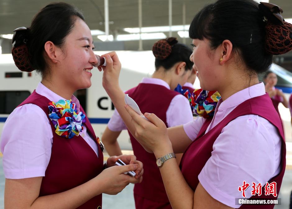 As the Hefei-Fuzhou high speed rail - running 806 kilometers from Hefei of Anhui province to Fuzhou of Fujian province - will soon be officially opened, 190 stewardesses who will serve on the trains show up in new uniform in Fuzhou Railway Station on June 24, 2015. (CNS/Yong Wanjun)