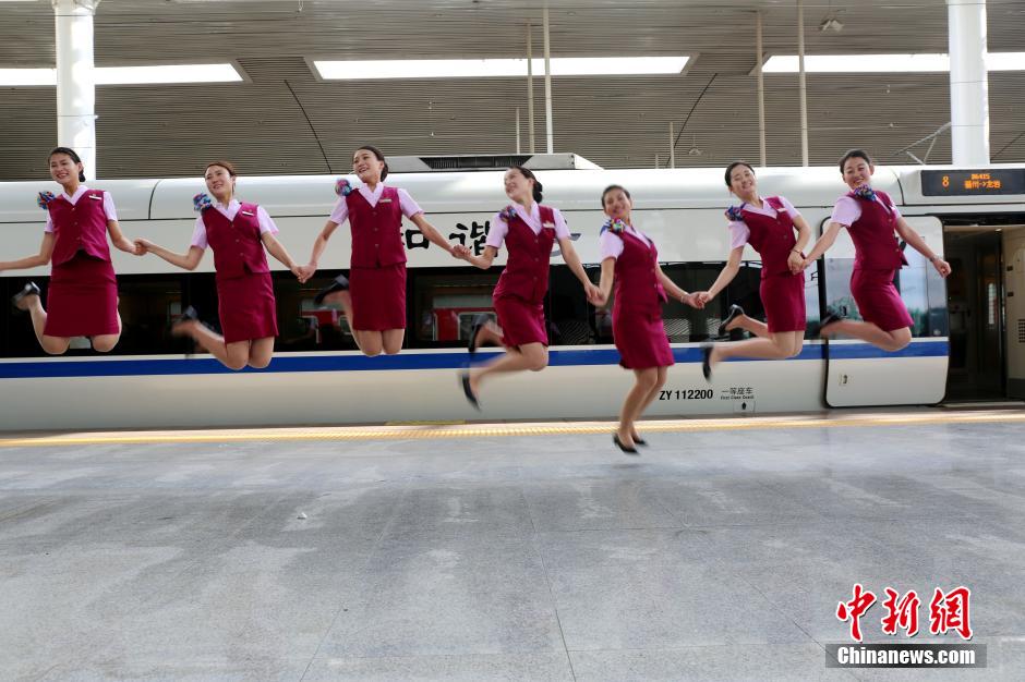 As the Hefei-Fuzhou high speed rail - running 806 kilometers from Hefei of Anhui province to Fuzhou of Fujian province - will soon be officially opened, 190 stewardesses who will serve on the trains show up in new uniform in Fuzhou Railway Station on June 24, 2015. (CNS/Yong Wanjun) |