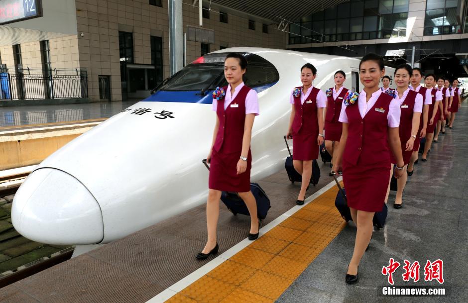 As the Hefei-Fuzhou high speed rail - running 806 kilometers from Hefei of Anhui province to Fuzhou of Fujian province - will soon be officially opened, 190 stewardesses who will serve on the trains show up in new uniform in Fuzhou Railway Station on June 24, 2015. (CNS/Yong Wanjun)