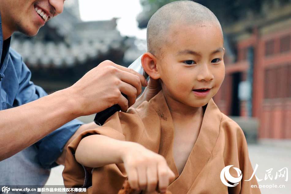 A master shaves hair for Kele at Zishou Temple in Lingshi county, north China's Shanxi province. (Photo/CFP)