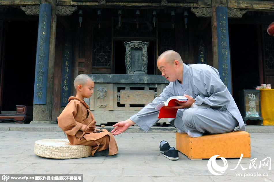 The cute little "monk" Kele practices with his master at Zishou Temple in Lingshi county, north China's Shanxi province. (Photo/CFP)