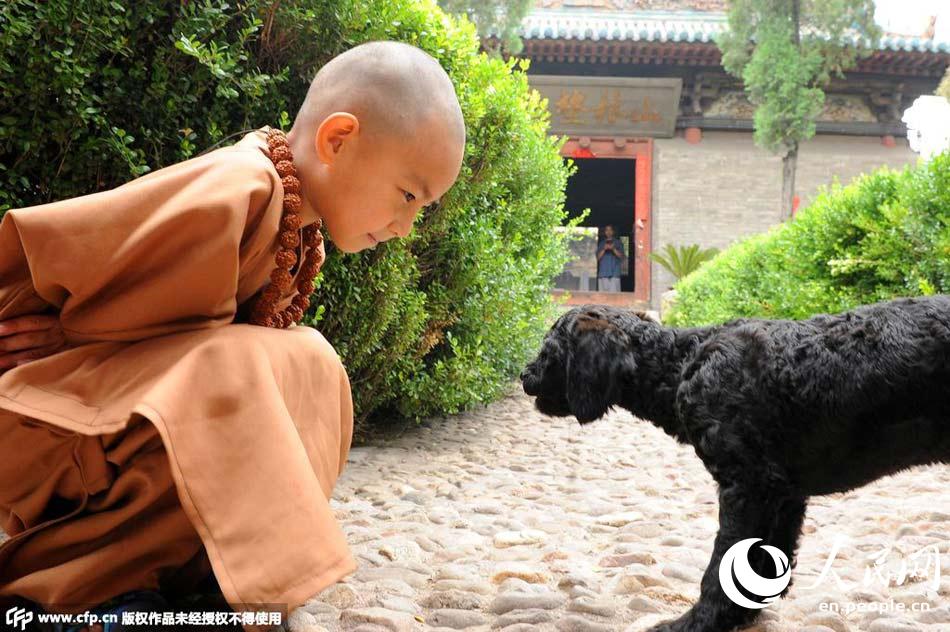 The cute little "monk" Kele plays with a black dog at Zishou Temple in Lingshi county, north China's Shanxi province. (Photo/CFP)
