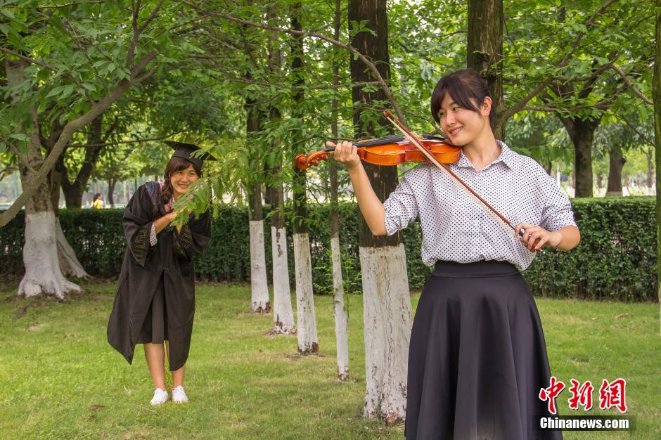 A group of creative graduation photos released by college students in Jinjiang College of Sichuan University has drawn much attention from the public. The students photoshopped themselves into the photos, showing their youth stories in fresh and romantic style. (Photo/Cao Rui)