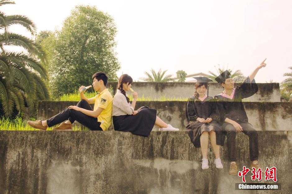 A group of creative graduation photos released by college students in Jinjiang College of Sichuan University has drawn much attention from the public. The students photoshopped themselves into the photos, showing their youth stories in fresh and romantic style. (Photo/Cao Rui)
