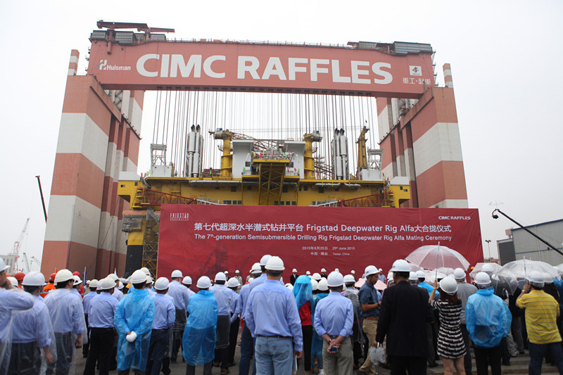 The mating ceremony of the world's largest ultra-deepwater semisubmersible drilling rig, built by CIMC Raffles for Norway's Frigstad, was held in Yantai production base on June 25, 2015.