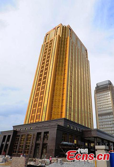 An office building glows under sunlight in Kunshan city, East China’s Jiangsu province, June 26, 2015. The 28-storey building is 99.9 meters high and has a yellow exterior, earning it the nickname of "gold bar building". (Photo/Ecns.cn)