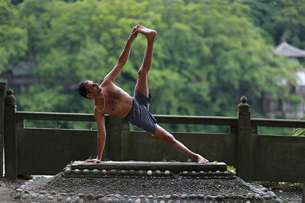 Sharath Jois, a yoga master from India, practices signature postures on Qingcheng Mountain in Dujiangyan, Sichuan province, during the India-China international yoga festival. [Photo/China Daily]