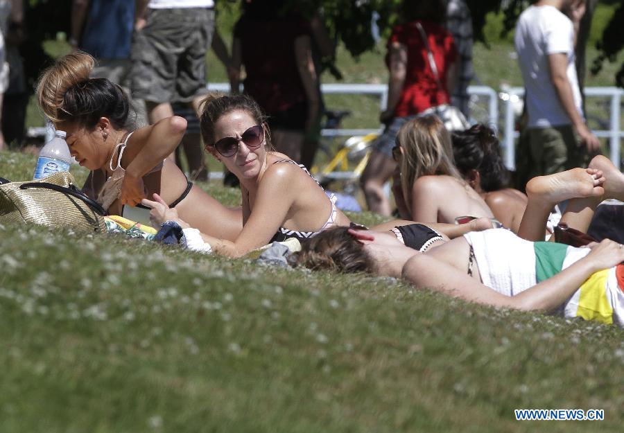 A resident enjoys sun tanning at a park in Vancouver, Canada, June 27, 2015. According to the weather forecast from Environment Canada, heat wave warning was issued in Vancouver with temperature expected to rise dramatically over the weekend with about 30 degree Celsius. The inland of British Columbia may hit at 40 degree. (Xinhua/Liang sen) |