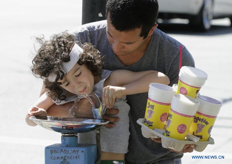 Residents drink water from a temporary drinking fountain at a street in Vancouver, Canada, June 27, 2015. According to the weather forecast from Environment Canada, heat wave warning was issued in Vancouver with temperature expected to rise dramatically over the weekend with about 30 degree Celsius. The inland of British Columbia may hit at 40 degree.(Xinhua/Liang sen) |