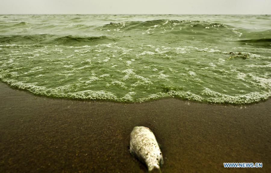 Photo taken on June 24, 2015 shows the Chaohu Lake breeding with blue-green algae in Chaohu City, east China's Anhui Province. Blue-green algae expand rampantly in Chaohu Lake recently, with the water turning into green as a result. (Xinhua) |