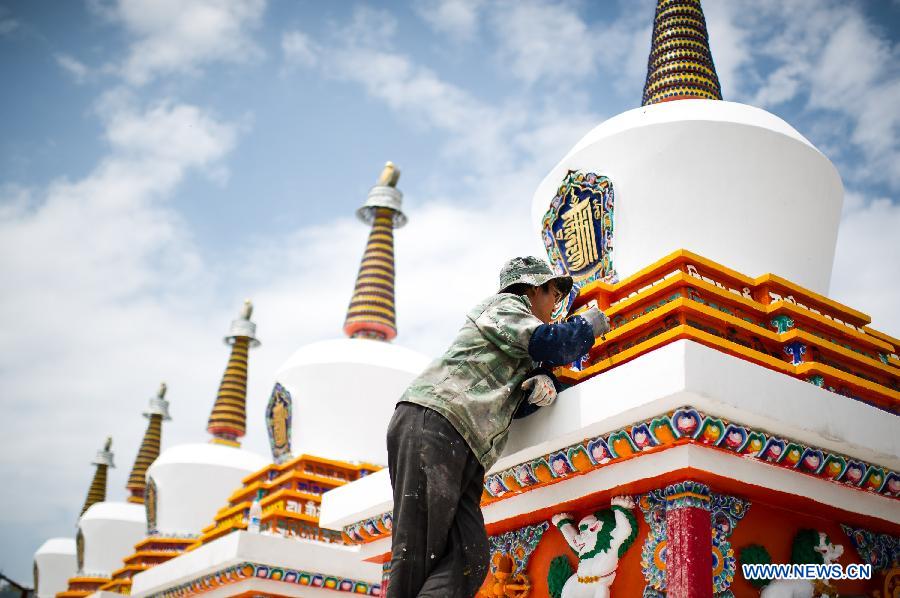 A staff member paints the pagoda at the Taer Monastery in Huangzhong County, northwest China's Qinghai Province, June 27, 2015. As peak tourism season falls recently, eight pagodas in the entrance of the Taer Monastery were repainted to welcome the visitors. (Xinhua/Wu Gang)