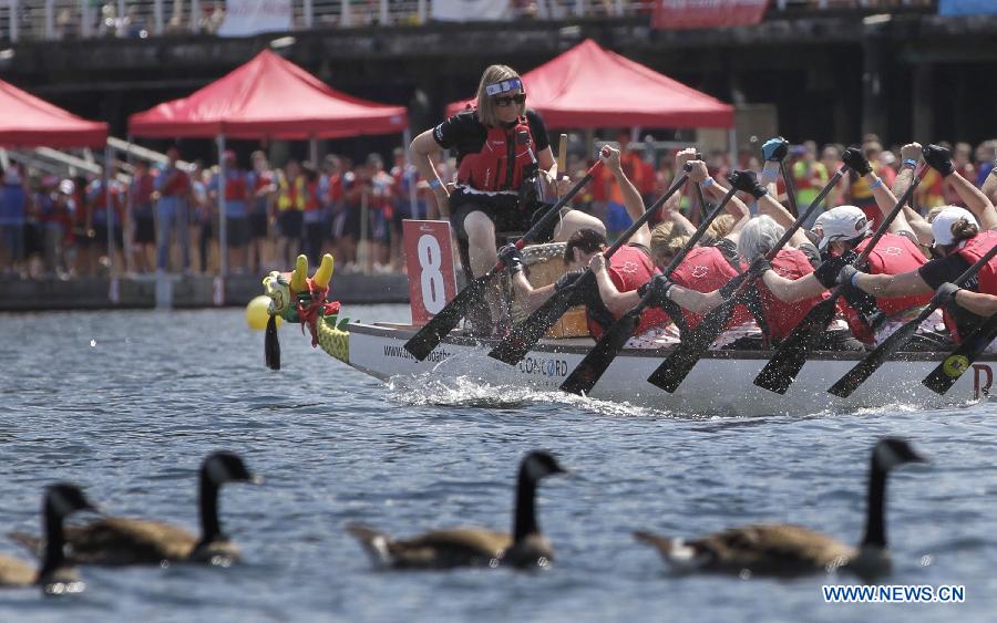 Paddlers compete on water during the dragon boat festival in Vancouver, Canada, June 20, 2015. Recognized as North America's biggest dragon boat festival, the Rio Tinto Alcan Dragon Boat Festival sees its 27th annual event from June 19 to 21. The festival attracted 188 teams with more than 5,000 paddlers competing on water and more than 100,000 spectators. (Xinhua/Liang sen) |