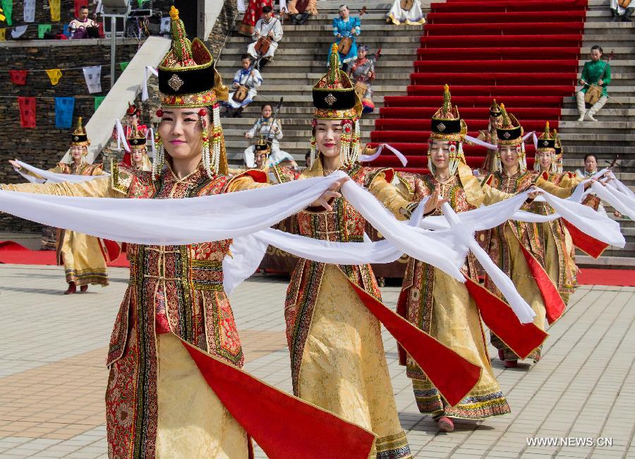 People perform folk dance during a Nadam fair in Hohhot, capital of north China's Inner Mongolia Autonomous Region, June 28, 2015. Nadam is a mass traditional Mongolian festival where people celebrate harvests and pray for good luck. (Xinhua/Ding Genhou)