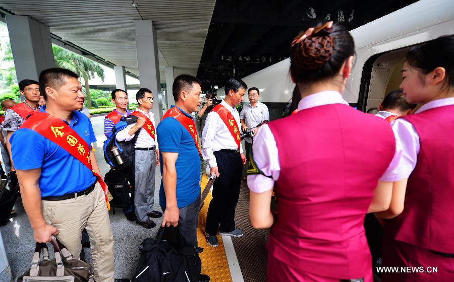 Model workers of Fujian Province experience taking the G5602 high-speed train departing from Fuzhou in southeast China's Fujian Province, June 28, 2015. The Hefei-Fuzhou high-speed railway was put into operated on Sunday, which spans east China's Anhui, Jiangxi Provinces and also southeast China's Fujian Province and shortens the travel hours from Hefei to southeast China's Fuzhou to within four hours. (Xinhua/Wei Peiquan) |