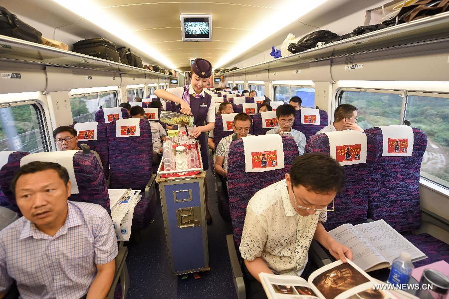 A steward serves passengers on the G2621 high-speed train from Hefei South to Fuzhou, June 28, 2015. The Hefei-Fuzhou high-speed railway was put into operated on Sunday, which spans east China's Anhui, Jiangxi Provinces and also southeast China's Fujian Province and shortens the travel hours from Hefei to southeast China's Fuzhou to within four hours. (Xinhua/Zhang Duan) |