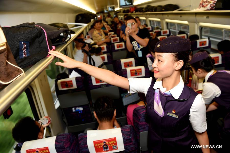 A steward of the G2621 high-speed train from Hefei South to Fuzhou puts away baggage on train, June 28, 2015. The Hefei-Fuzhou high-speed railway was put into operated on Sunday, which spans east China's Anhui, Jiangxi Provinces and also southeast China's Fujian Province and shortens the travel hours from Hefei to southeast China's Fuzhou to within four hours. (Xinhua/Liu Junxi) |