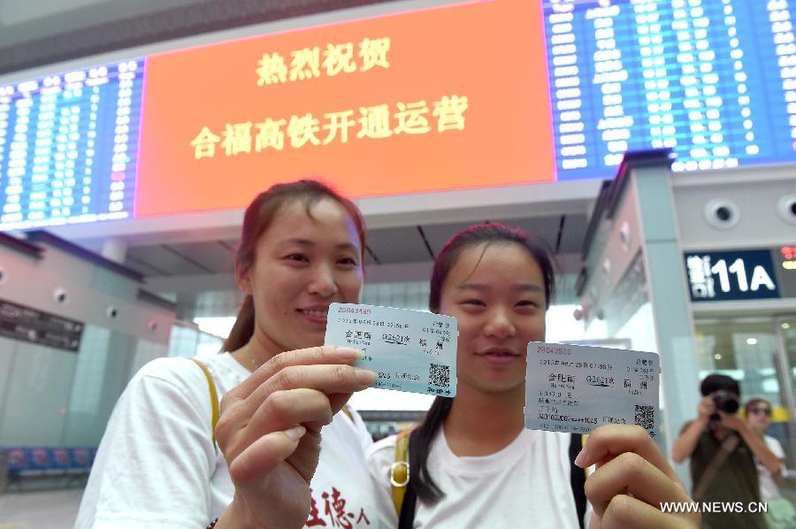 Passengers show their tickets for the G2621 high-speed train at the Hefei South Railway Station in Hefei, capital of east China's Anhui Province, June 28, 2015. The Hefei-Fuzhou high-speed railway was put into operated on Sunday, which spans east China's Anhui, Jiangxi Provinces and also southeast China's Fujian Province and shortens the travel hours from Hefei to southeast China's Fuzhou to within four hours. (Xinhua/Guo Chen) |