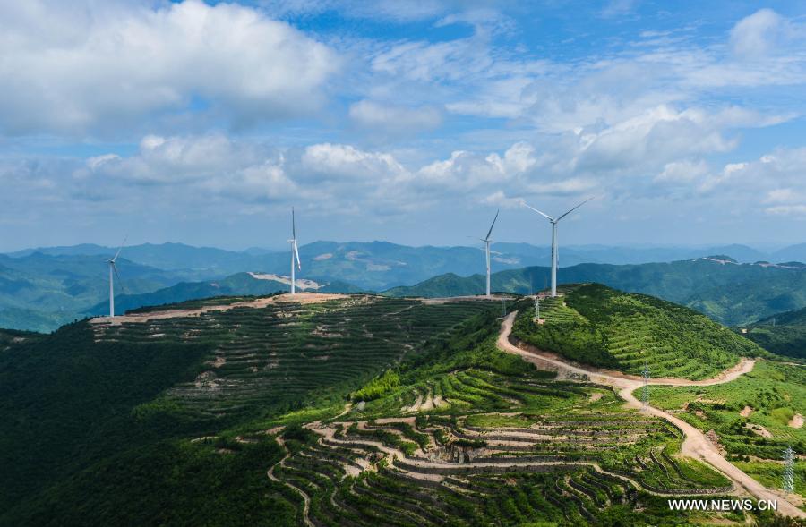 Photo taken on June 27, 2015 shows an aerial view of the Weixin wind power farm in Pan'an County, east China's Zhejiang Province. (Xinhua/Xu Yu)