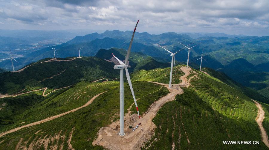 Photo taken on June 27, 2015 shows an aerial view of the Weixin wind power farm in Pan'an County, east China's Zhejiang Province. (Xinhua/Xu Yu)