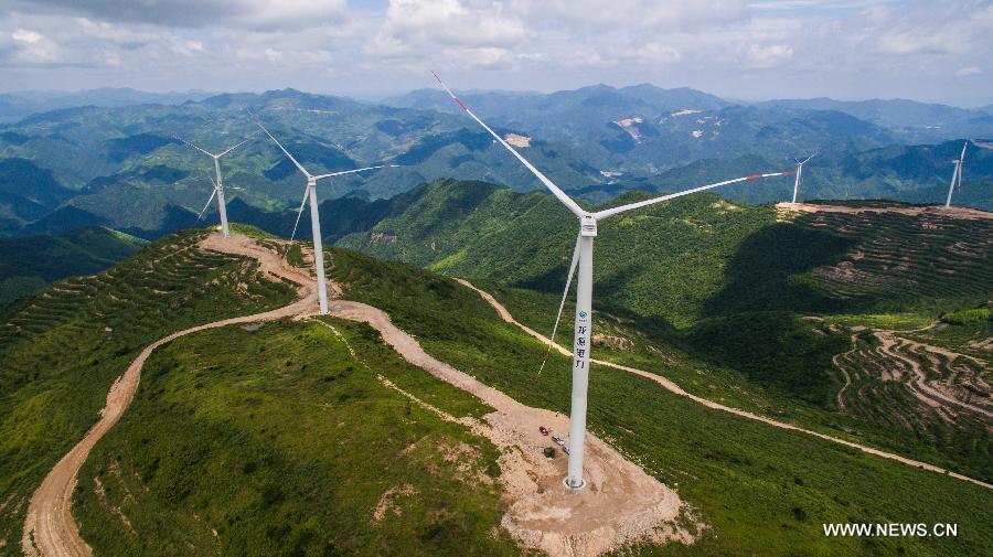 Photo taken on June 27, 2015 shows an aerial view of the Weixin wind power farm in Pan'an County, east China's Zhejiang Province. (Xinhua/Xu Yu)