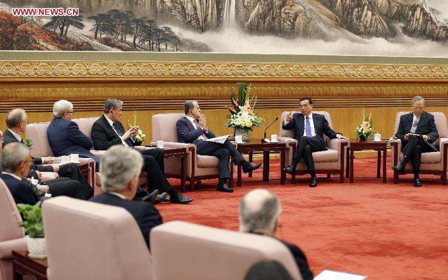 Chinese Premier Li Keqiang (2nd R) holds talks with overseas representatives who come here to attend the 4th Global Think Tank Summit, in Beijing, capital of China, June 26, 2015. (Xinhua/Zhang Duo)