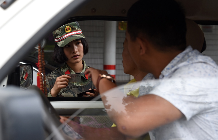 Zhang Liu checks the identity of a driver at the inspection post.(Photo/ Xinhua)
