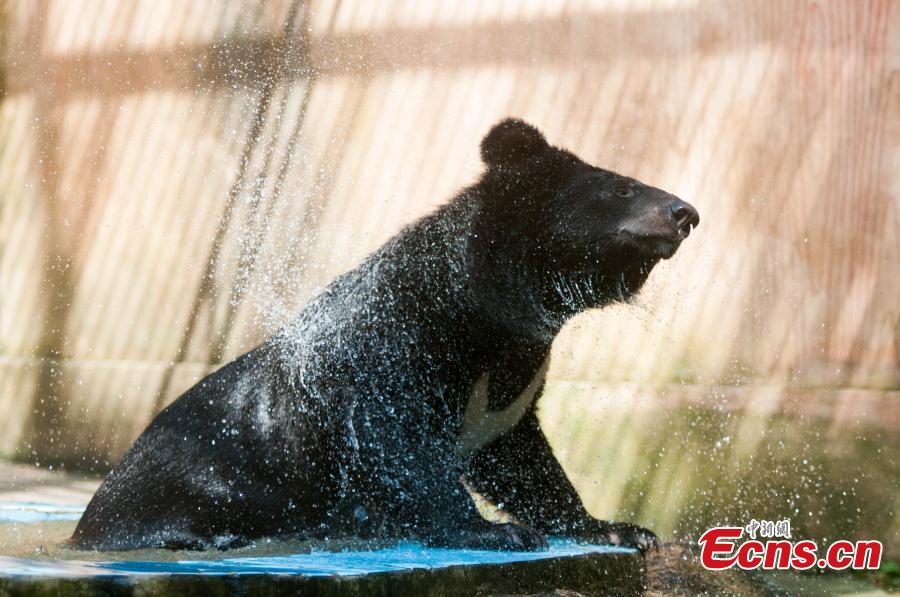 A black bear enjoys cool water at a zoo in Liuzhou city, Southwest China’s Guangxi Zhuang autonomous region, June 30, 2015. The zoo has tried different ways to help animals feel cool as the city suffered lingering heat waves. Temperature rose to 36 degrees Celsius on Tuesday. (Photo: China News Service/Huang Weiming)
