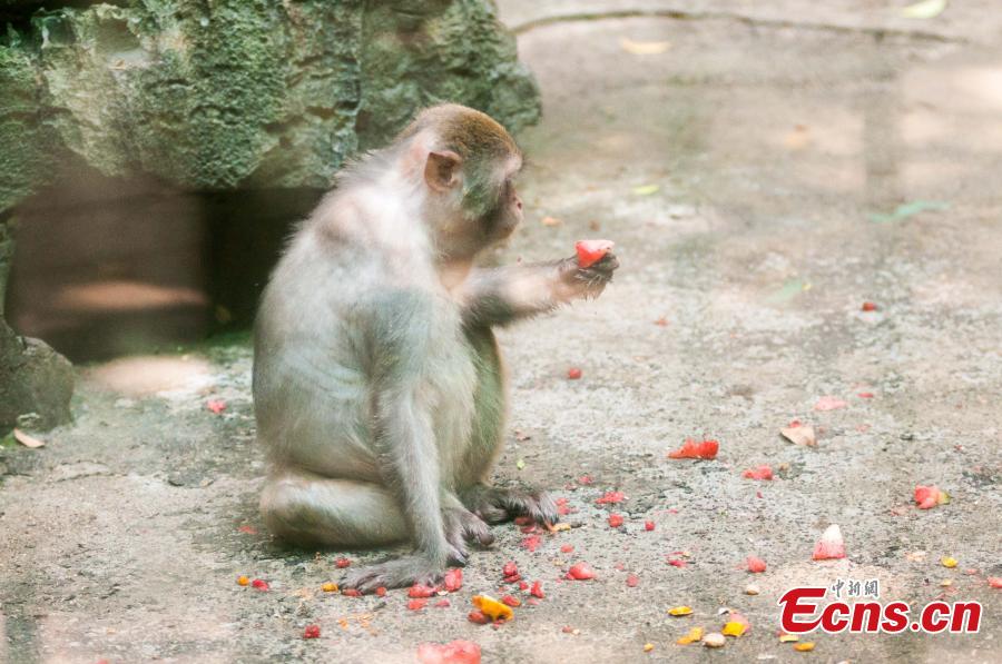 A monkey chews watermelon at a zoo in Liuzhou city, Southwest China’s Guangxi Zhuang autonomous region, June 30, 2015. The zoo has tried different ways to help animals feel cool as the city suffered lingering heat waves. Temperature rose to 36 degrees Celsius on Tuesday. (Photo: China News Service/Huang Weiming) |