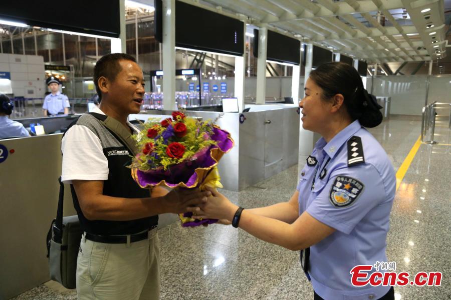 A Taiwan man is greeted with flowers at a port in Guangzhou, South China’s Guangdong province, July 1, 2015. The man was the first to visit the mainland after the mainland removed the entry permit requirement for Taiwan residents starting from July 1. In the past, Taiwan residents had to apply for a visa-like entry permit to visit the mainland. (Photo: China News Service/Xie Daxin) |