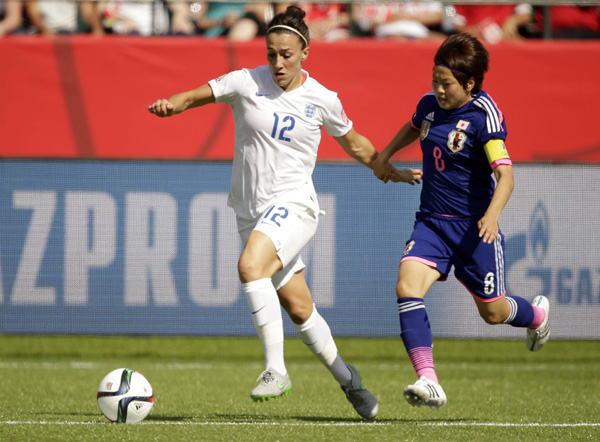 England defender Lucy Bronze (12) shoots the ball against Japan midfielder Aya Miyama (8) during the first half in the semifinals of the FIFA 2015 Women's World Cup at Commonwealth Stadium. [Photo/Agencies]