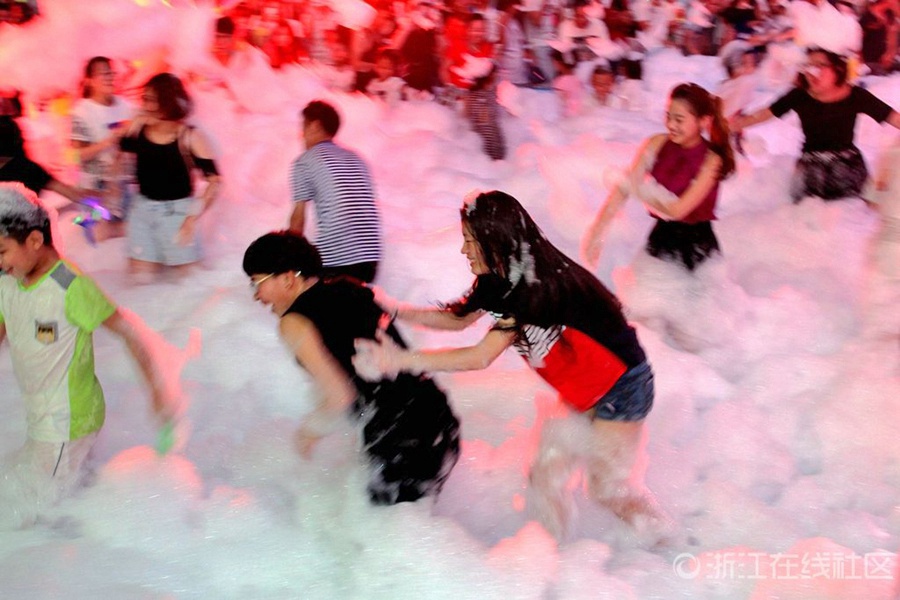 Participants to a night foam party revel in colorful bubbles in front of a shopping mall in the walking street in Jinhua, east China's Zhejiang province on July 1, 2015. (Photo/ zjol.com.cn)