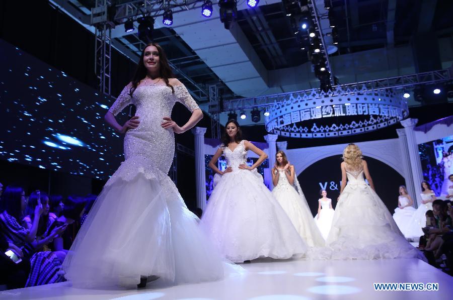 Models present wedding dresses during 2015 China Wedding Expo in Shanghai, east China, July 2, 2015. The expo kicked off on Thursday. (Xinhua/Pei Xin)