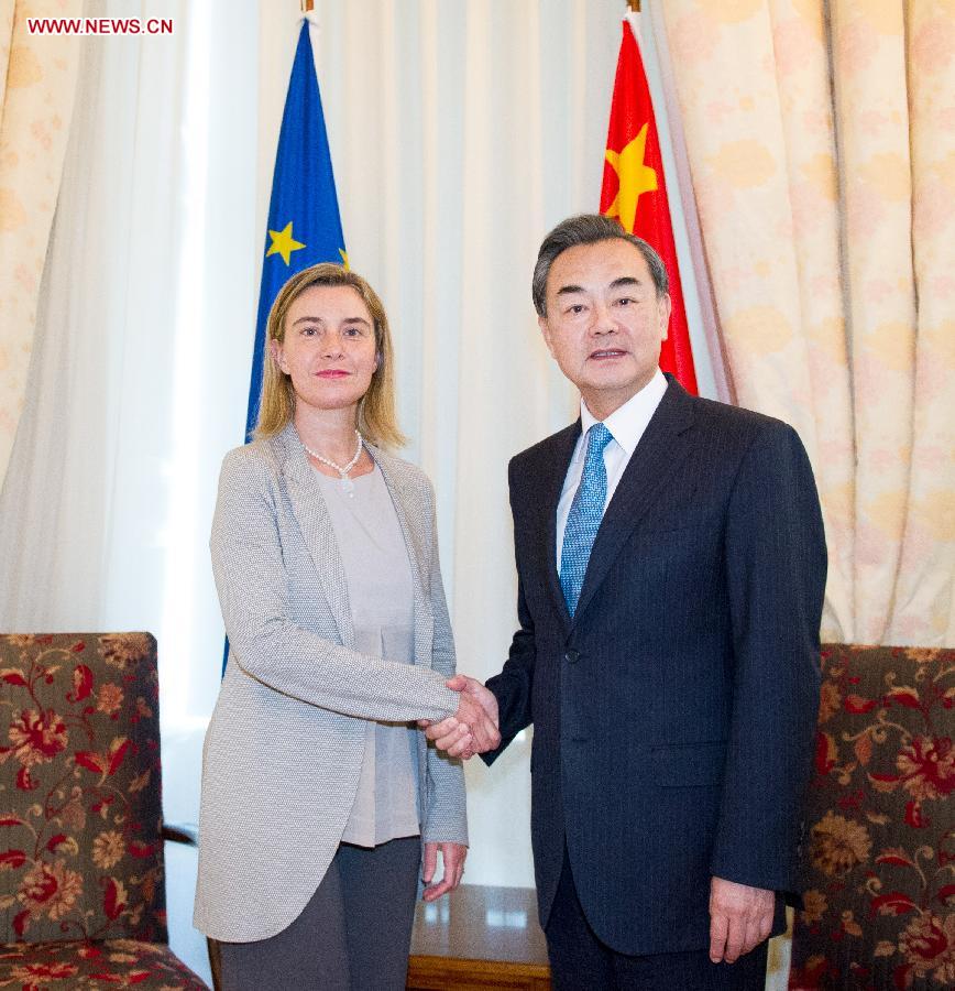 Chinese Foreign Minister Wang Yi(R) meets with Federica Mogherini, European Union (EU) High Representative for Foreign Affairs and Security Policy during the ongoing nuclear negotiation in Vienna, Austria, on July 2, 2015. (Xinhua/Qian Yi)
