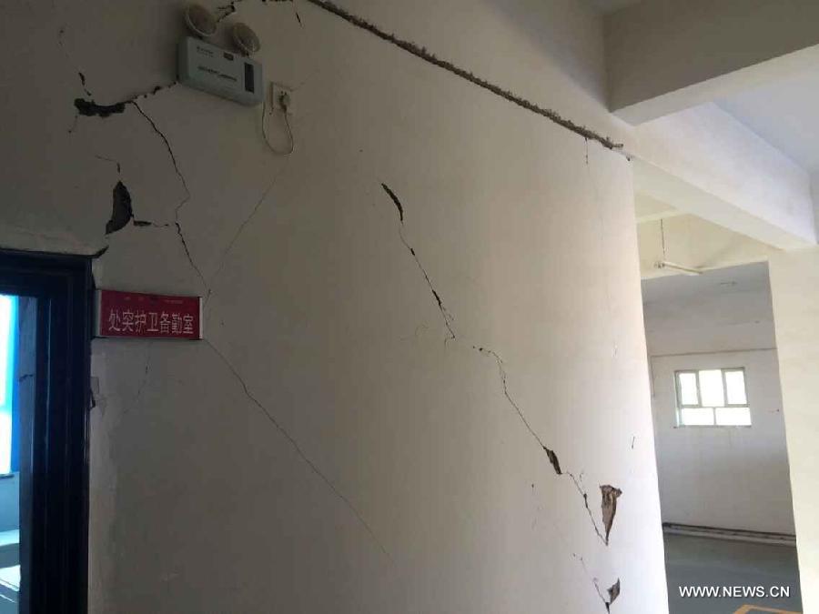 Photo taken with a cellphone on July 3, 2015 shows cracks on a building wall at the Pishan Fire Brigade after a 6.5-magnitude earthquake in Pishan County, northwest China's Xinjiang Uygur Autonomous Region. (Xinhua/Bian Kaiqiang) |