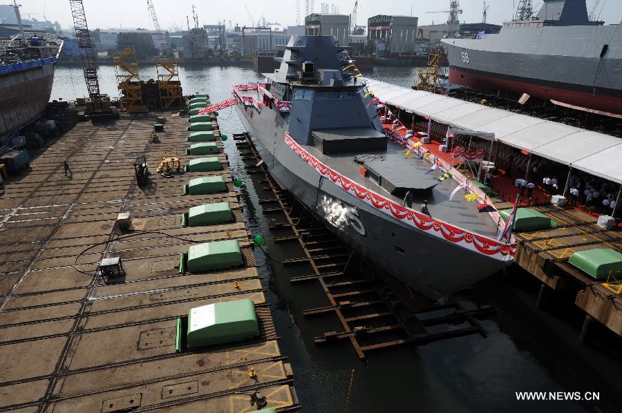 Photo taken on July 3, 2015 shows a littoral mission vessel "RSS Independence" berthing at Singapore's ST Marine Benoi Shipyard. Singapore's Navy on Friday held a launch ceremony for its very first of six littoral mission vessels "RSS Independence". (Xinhua/Then Chih Wey)