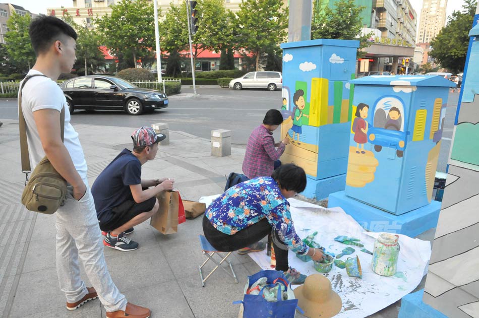Liu paints on a distribution box in Huangdao district, Qingdao, east China's Shandong province. (yx.iqilu.com/Zhang Jingang)