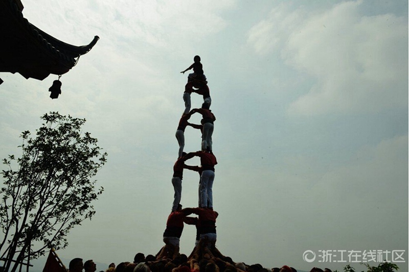 A total of 190 performers from Spain build human towers - 'Castells', a Catalan tradition originating in the 18th century, on July 2, 2015 in Hangzhou, east China. (Photo/ zjol.com.cn)